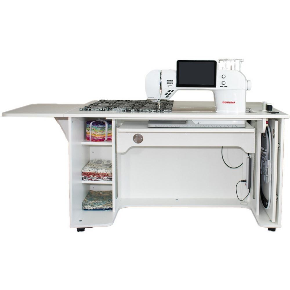 Loading... Please wait...The NEW Model 9030 is the ultimate space-saving solution for those needing a cabinet that fits today’s largest sewing machines. Designed with efficiency in mind, it features adjustable shelving and dedicated storage for embroidery hoops. The rear drop leaf and left-side swing-up table provide an expandable work surface for large projects. Plus, you get more leg and knee room than ever before in a compact cabinet.